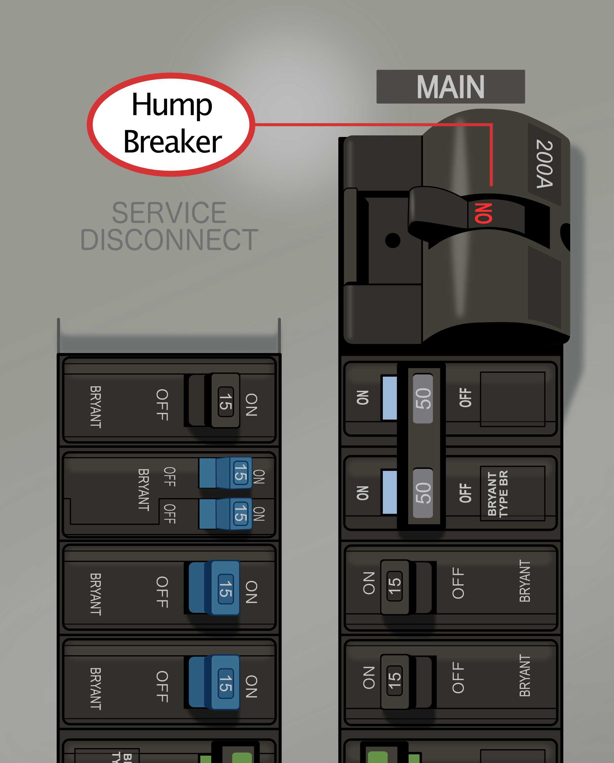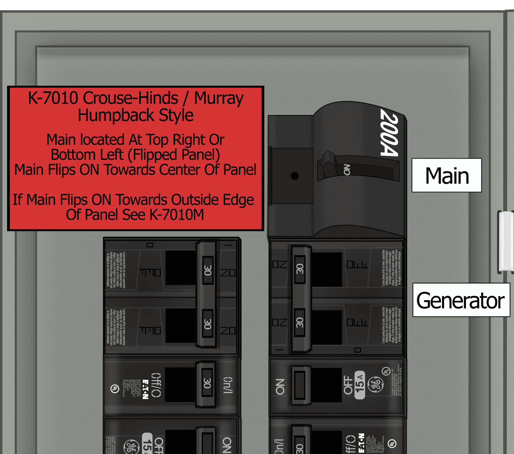 - Main breaker toggle action: Horizontal (left-right) throw direction ON & OFF