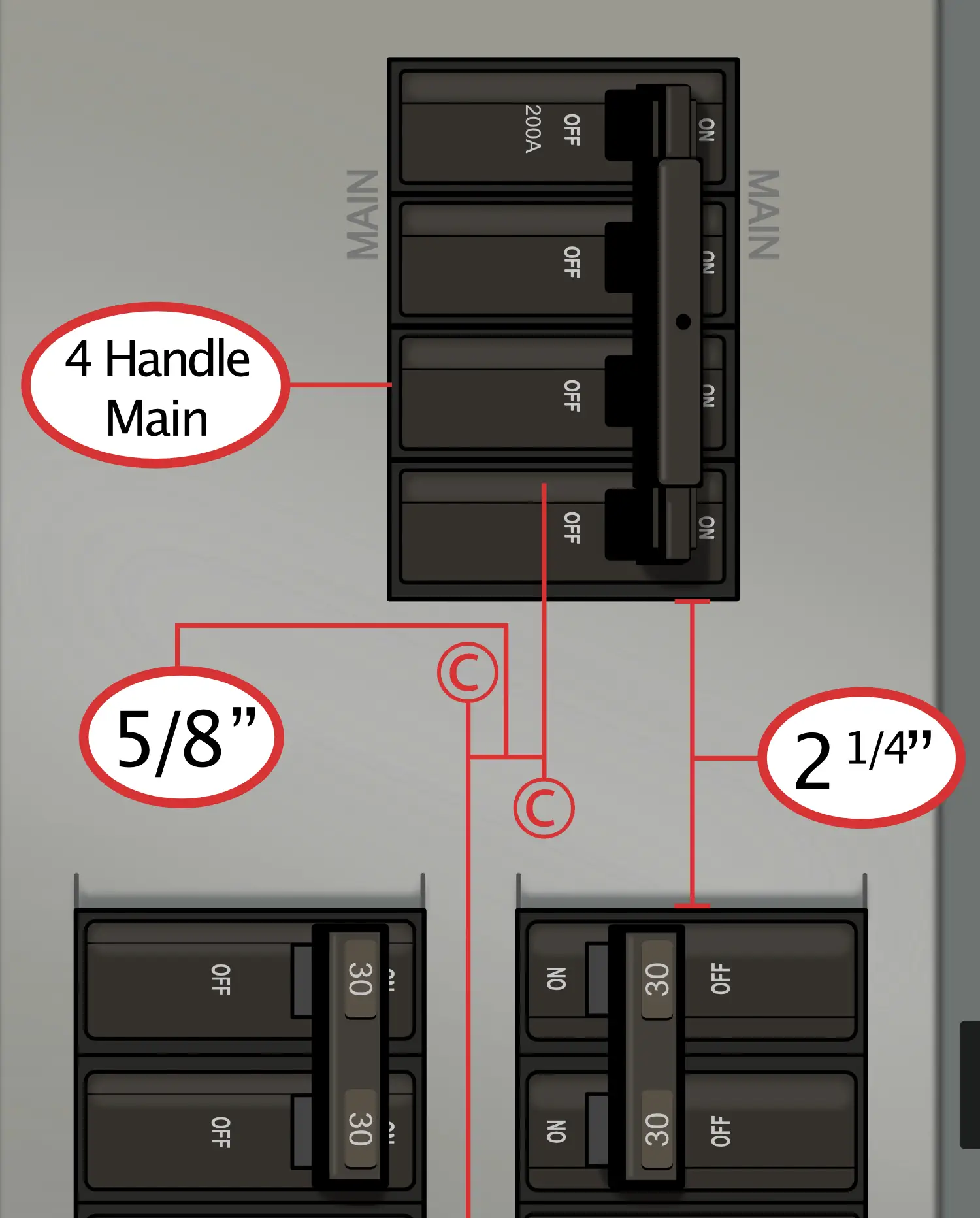 - Gap between the main breaker and columns below, is: 2 1/4″