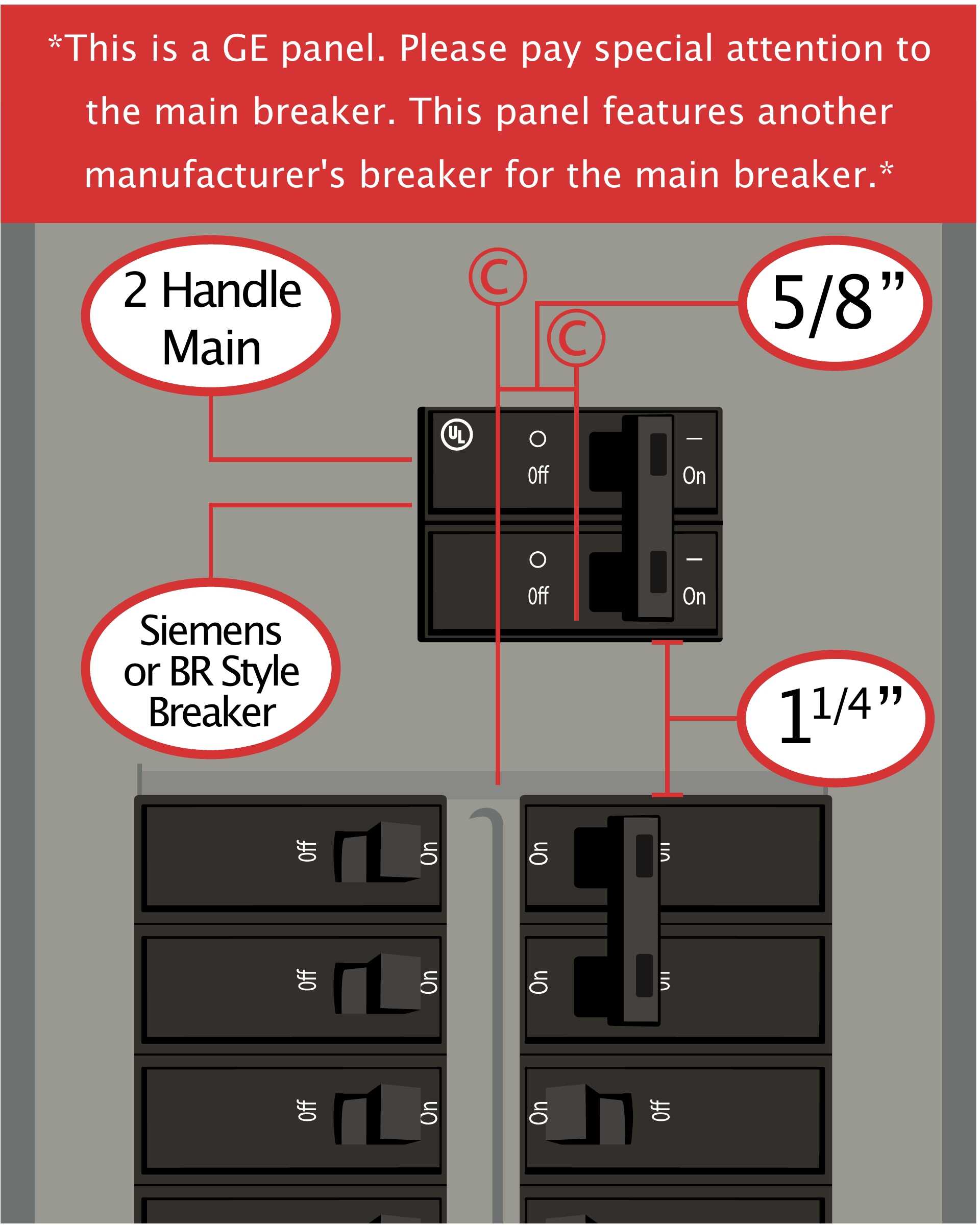 - Main breaker is offset from the center: 5/8″ to the right