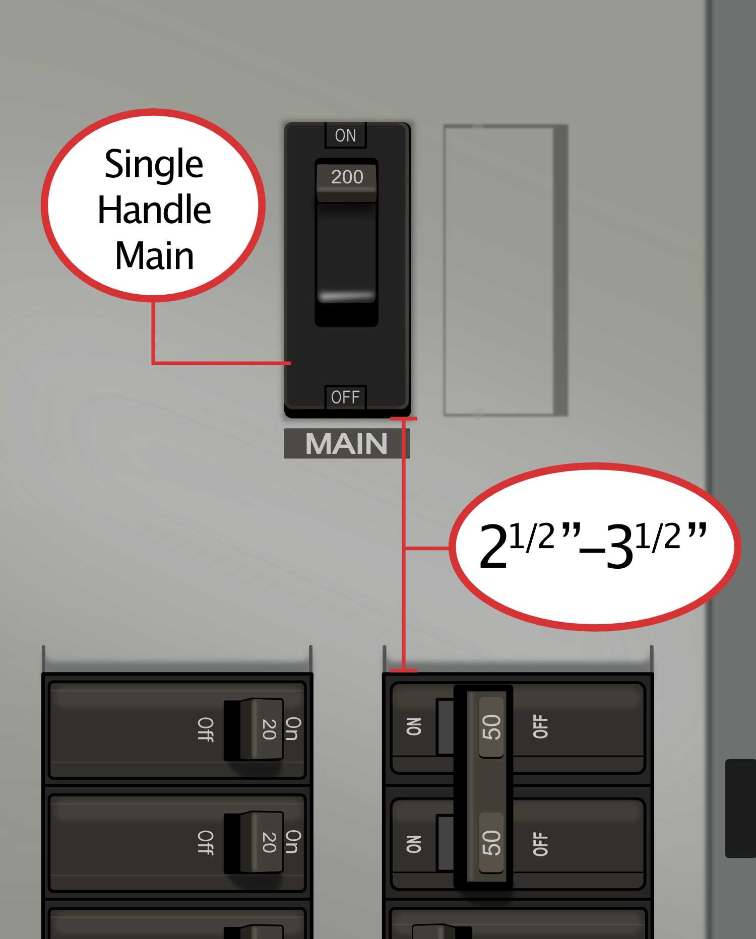 - Main breaker toggle action: vertical (up & down) throw direction ON & OFF