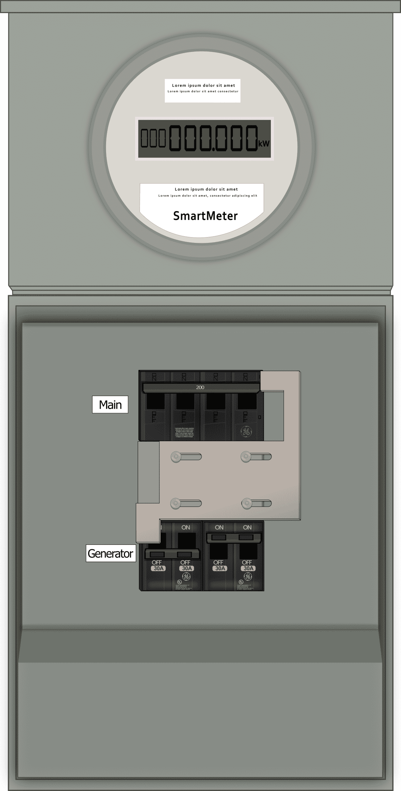 - Main breaker toggle action: vertical (up-down) throw direction ON & OFF