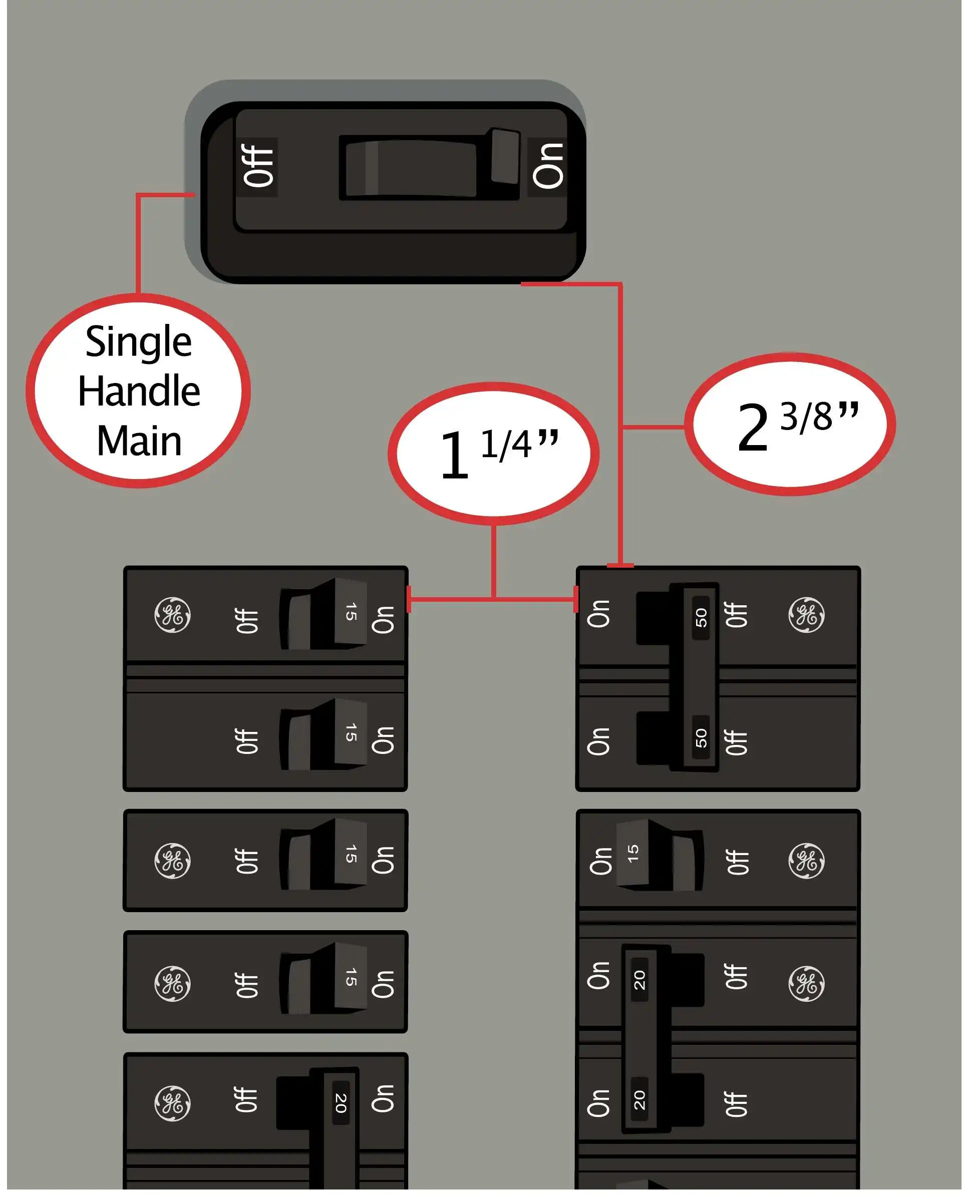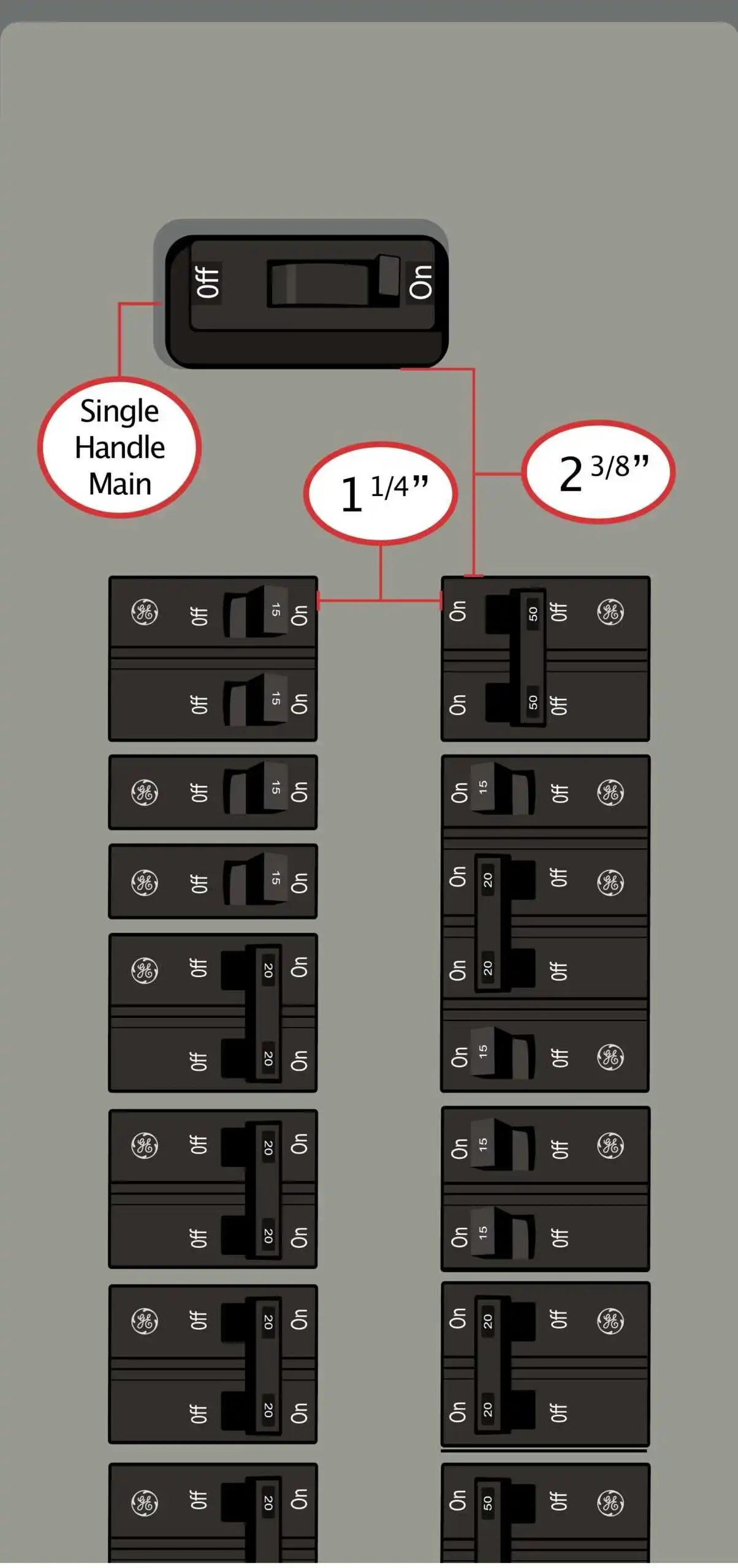 - Gap between the main breaker and columns below is: 2 3/8″ approximately