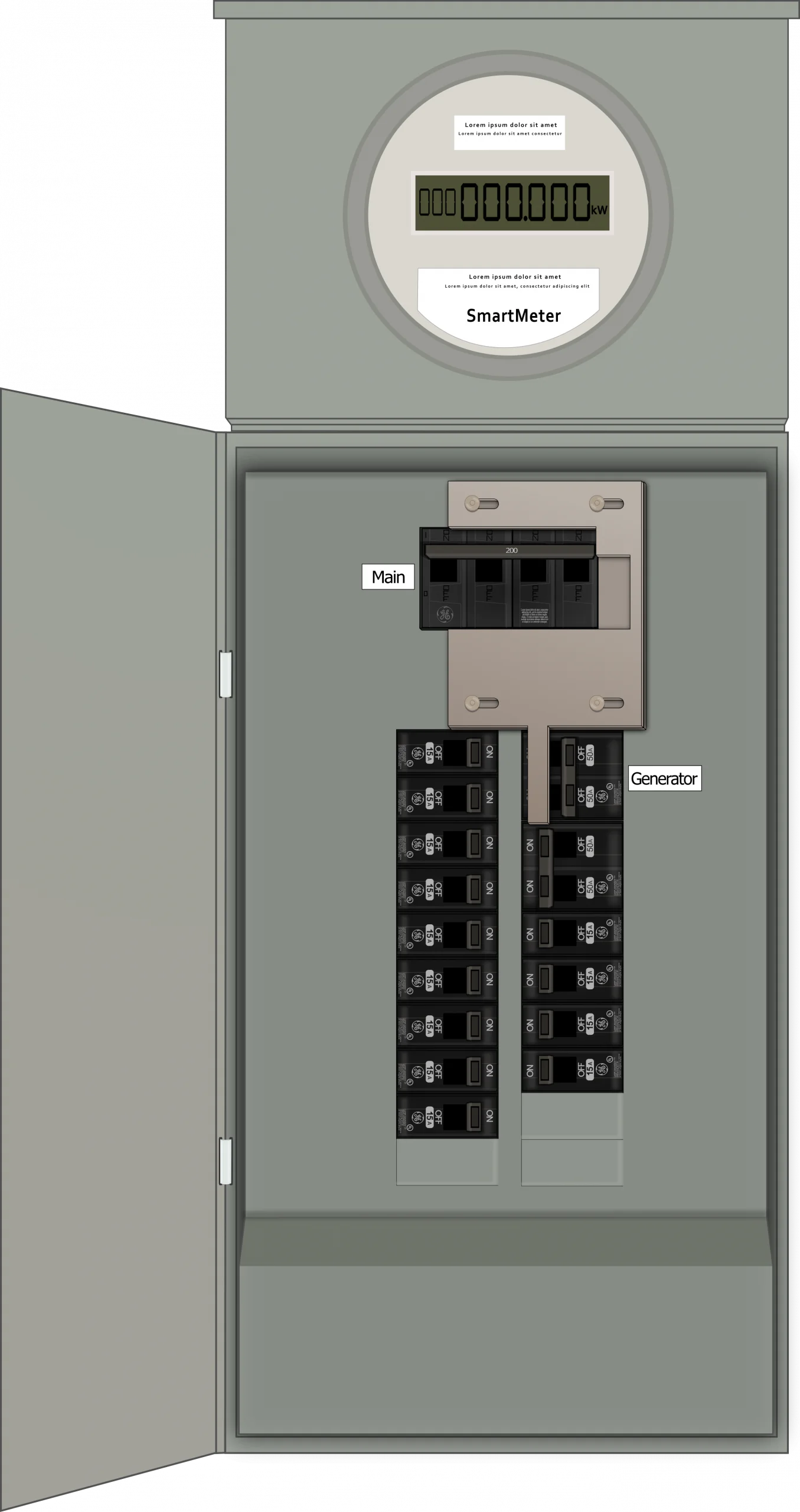 - Main Breaker toggle action: Vertical (up & down) throw direction ON & OFF