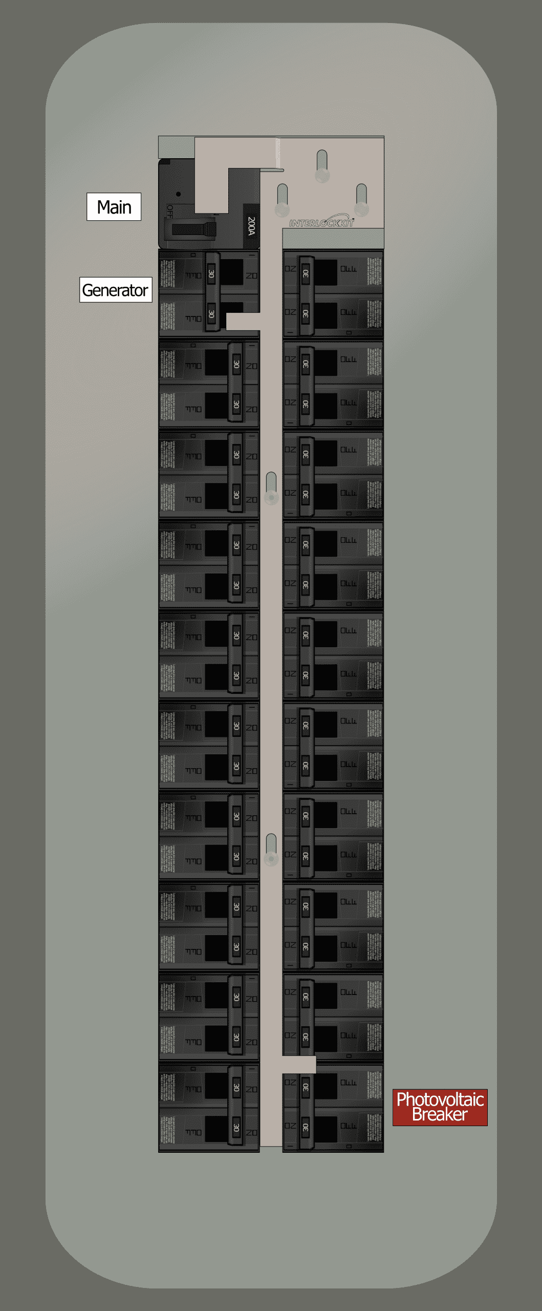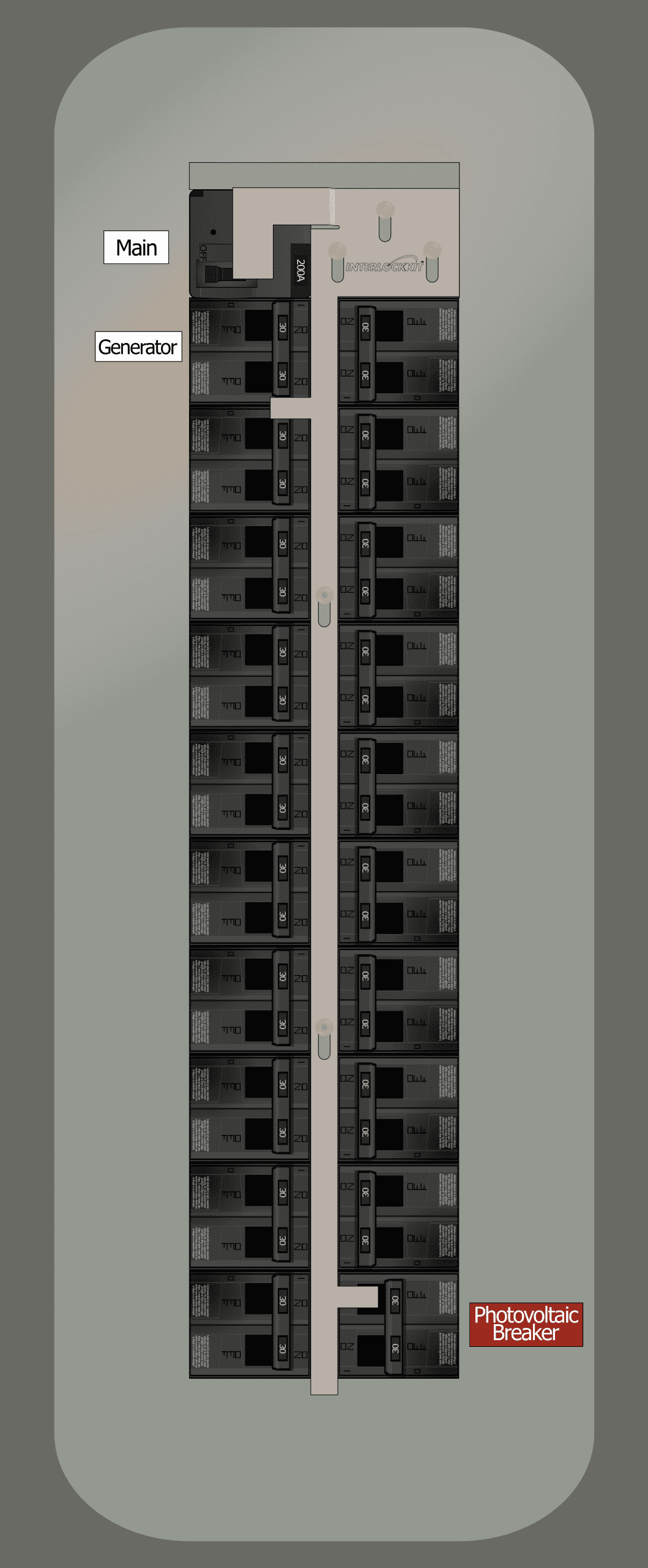 - Install a 2 pole photovoltaic breaker at the bottom of the right column: spaces 18 & 20