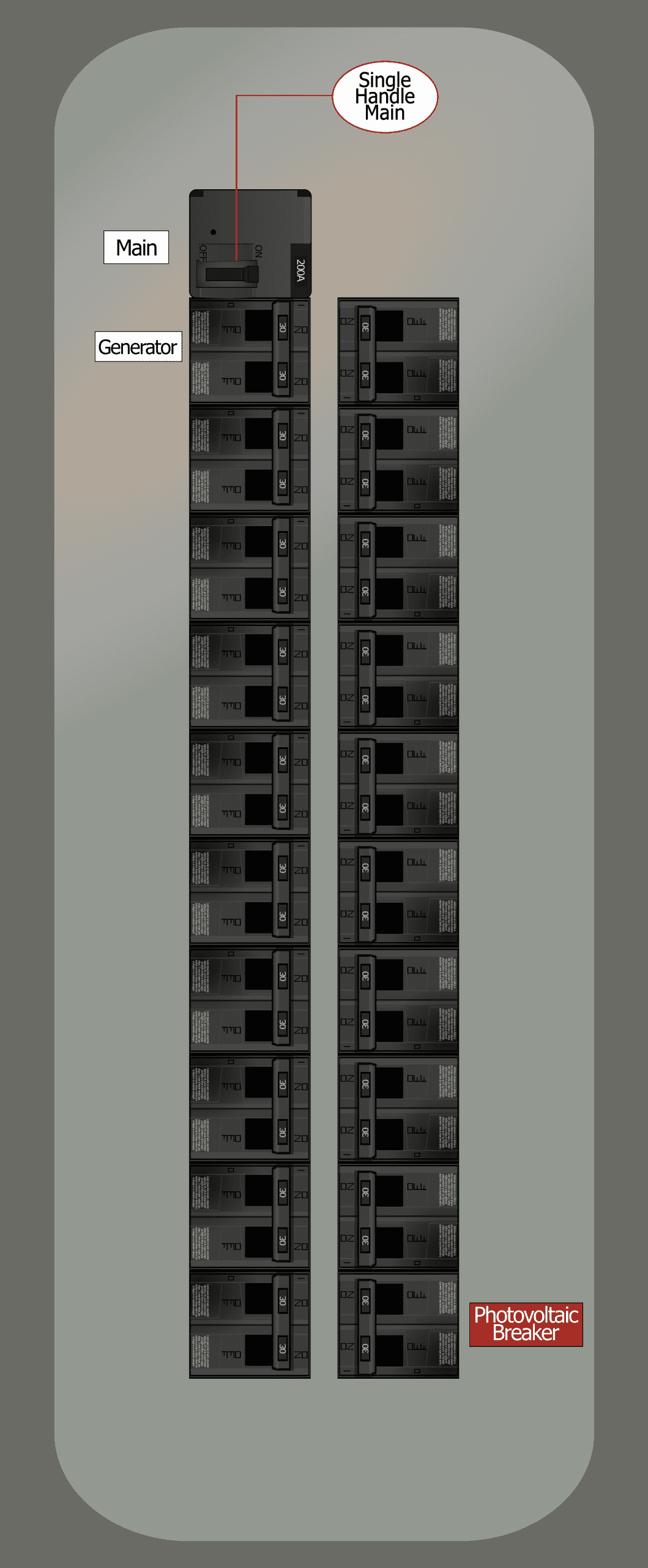 - The main breaker sits directly on top of breaker stack in the left breaker column