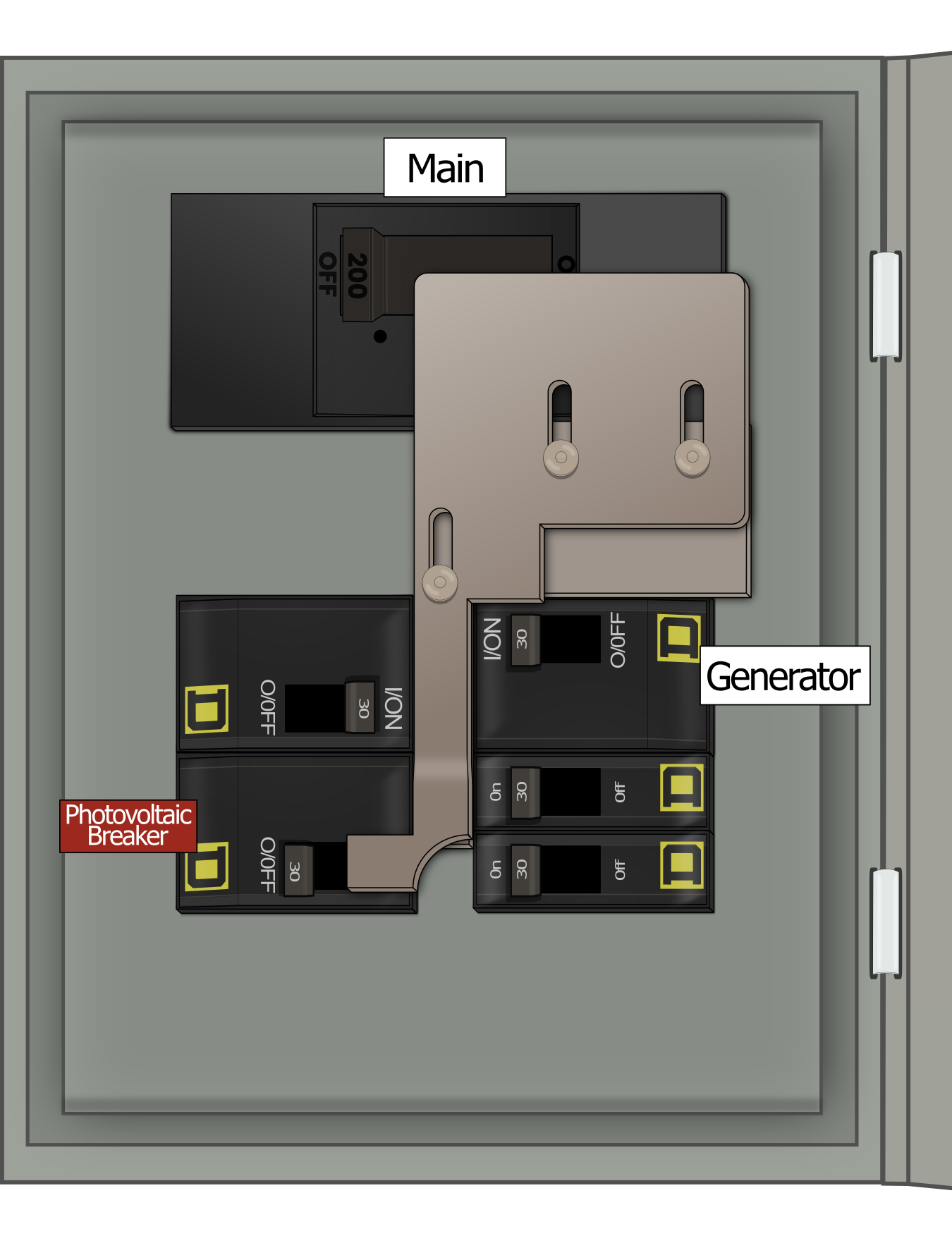• Main breaker toggle action: horizontal (left-right) throw direction