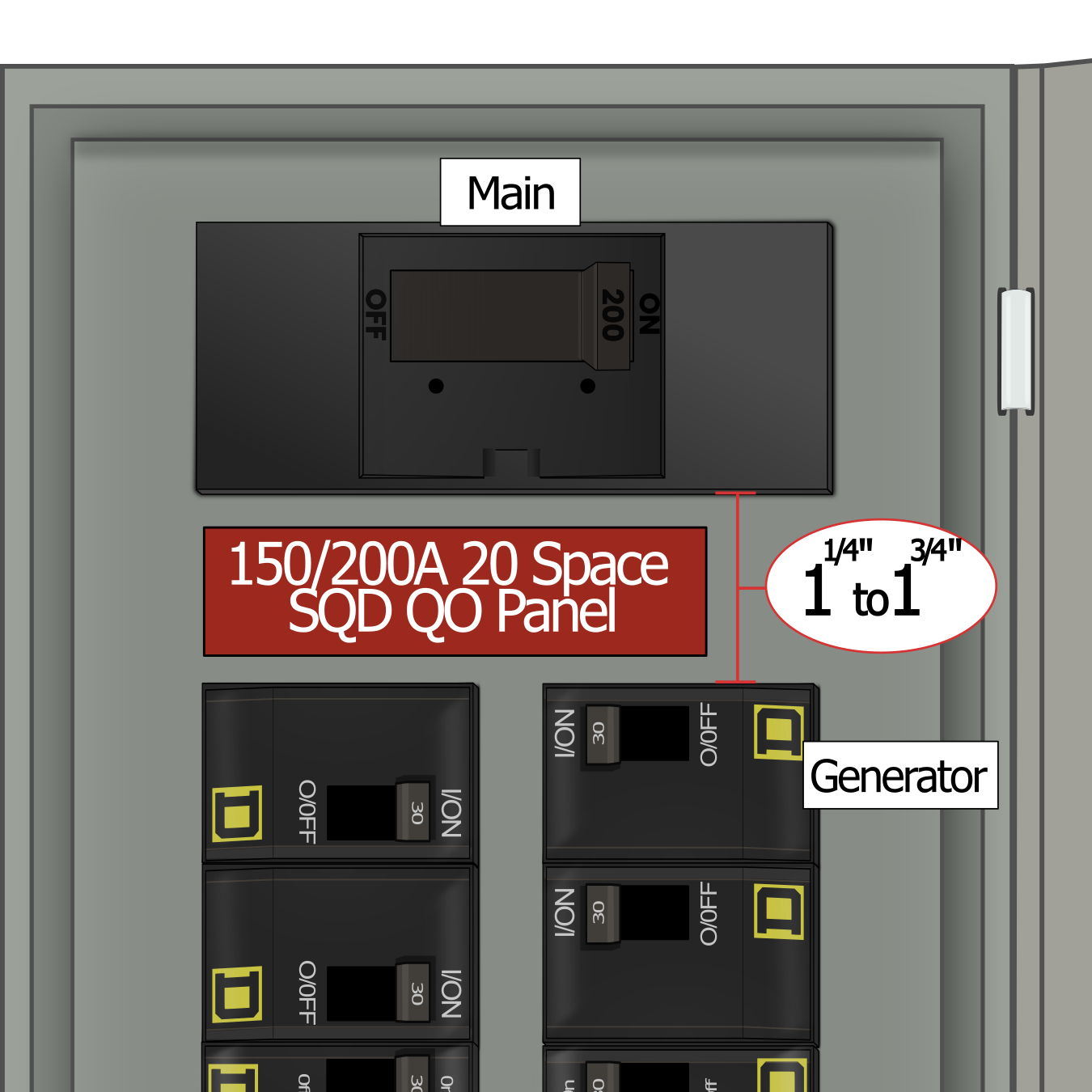 - Gap between main breaker and columns below: 1 1/4 - 1 1/2"