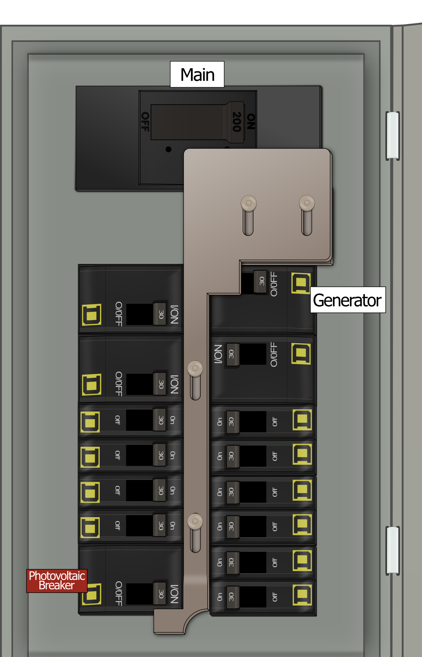 - Main breaker toggle action: horizontal (left-right) throw direction