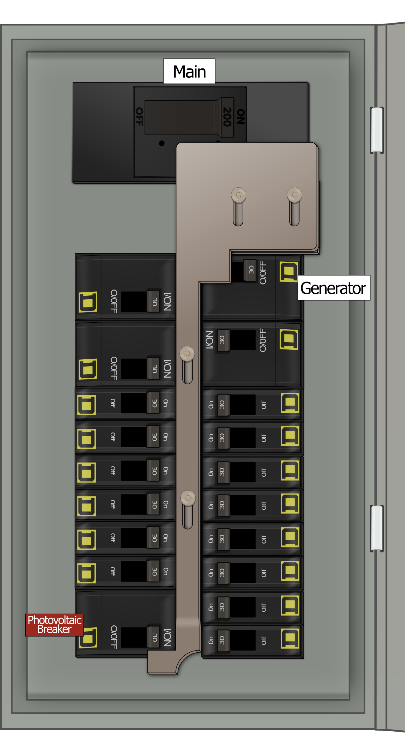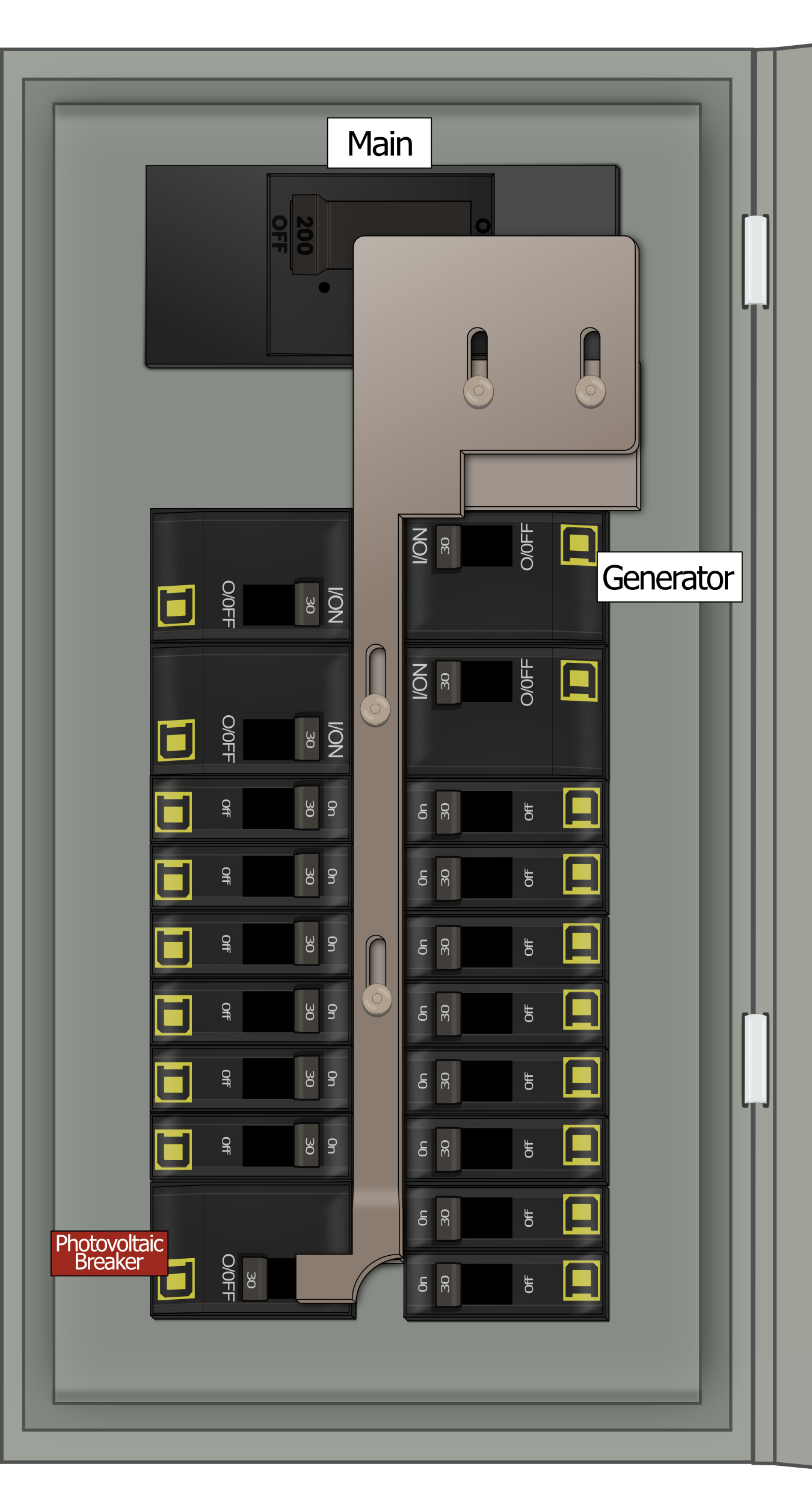 - Main breaker toggle action: horizontal (left-right) throw direction