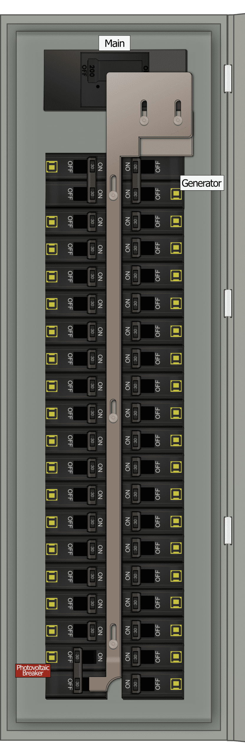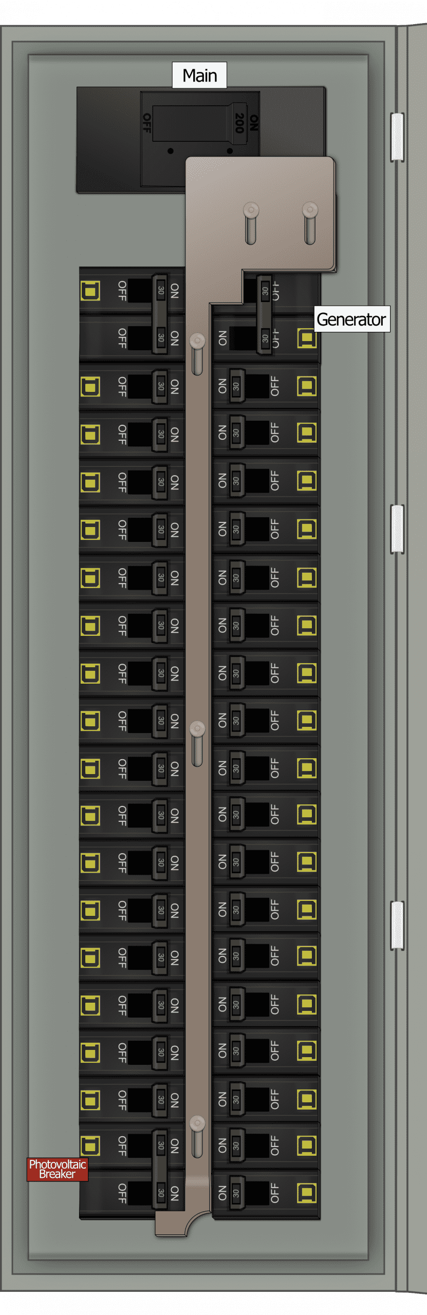 - Main breaker is centered over both breaker columns