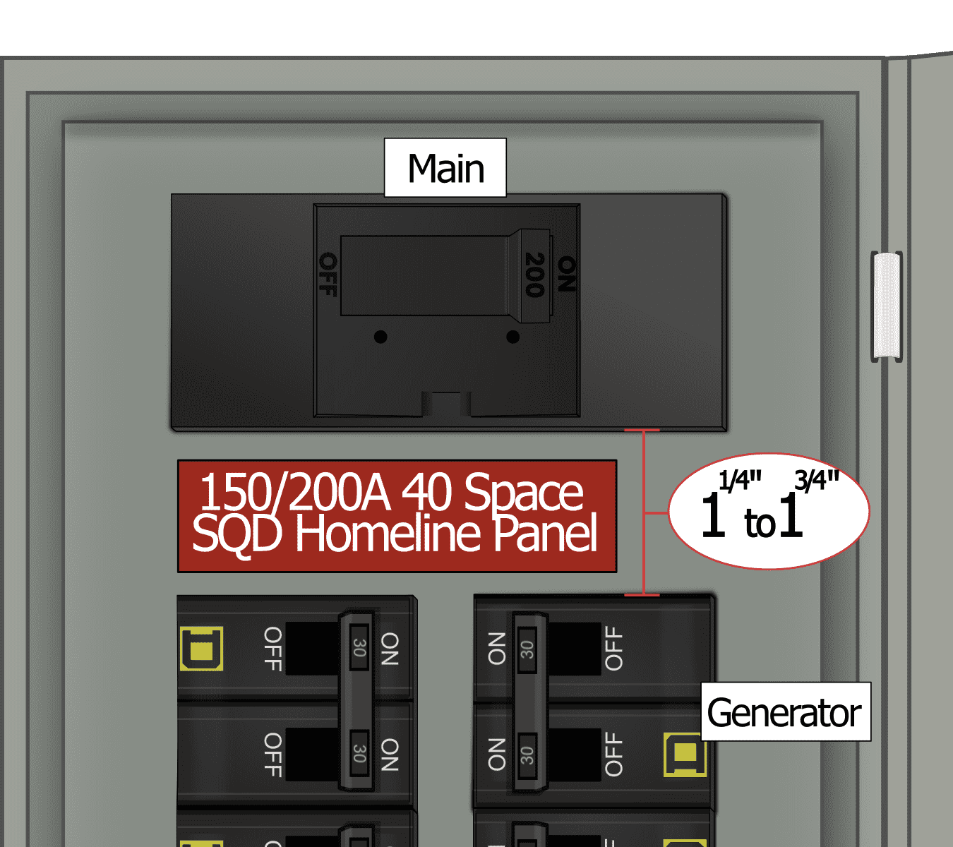 - Gap between main breaker and columns below: 1 1/4 - 1 1/2"