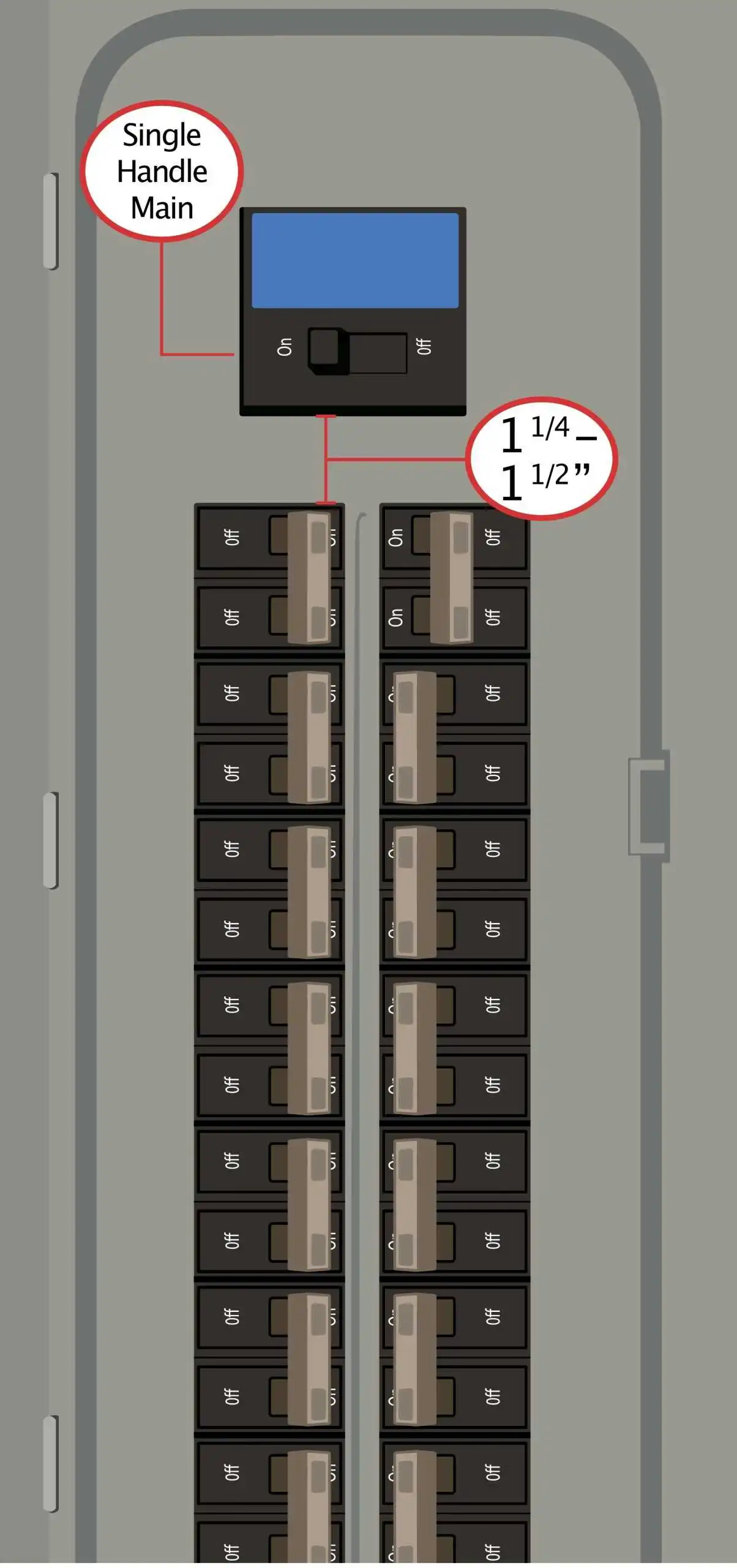 - Gap between main breaker and columns below: 1 1/4 - 1 1/2"
