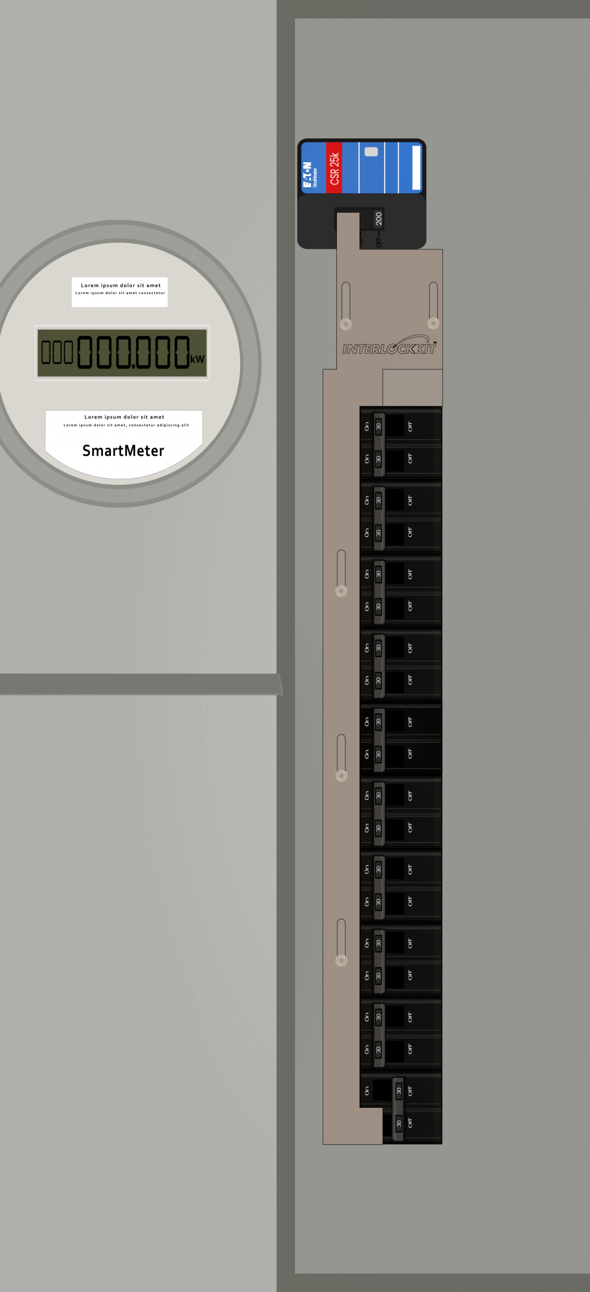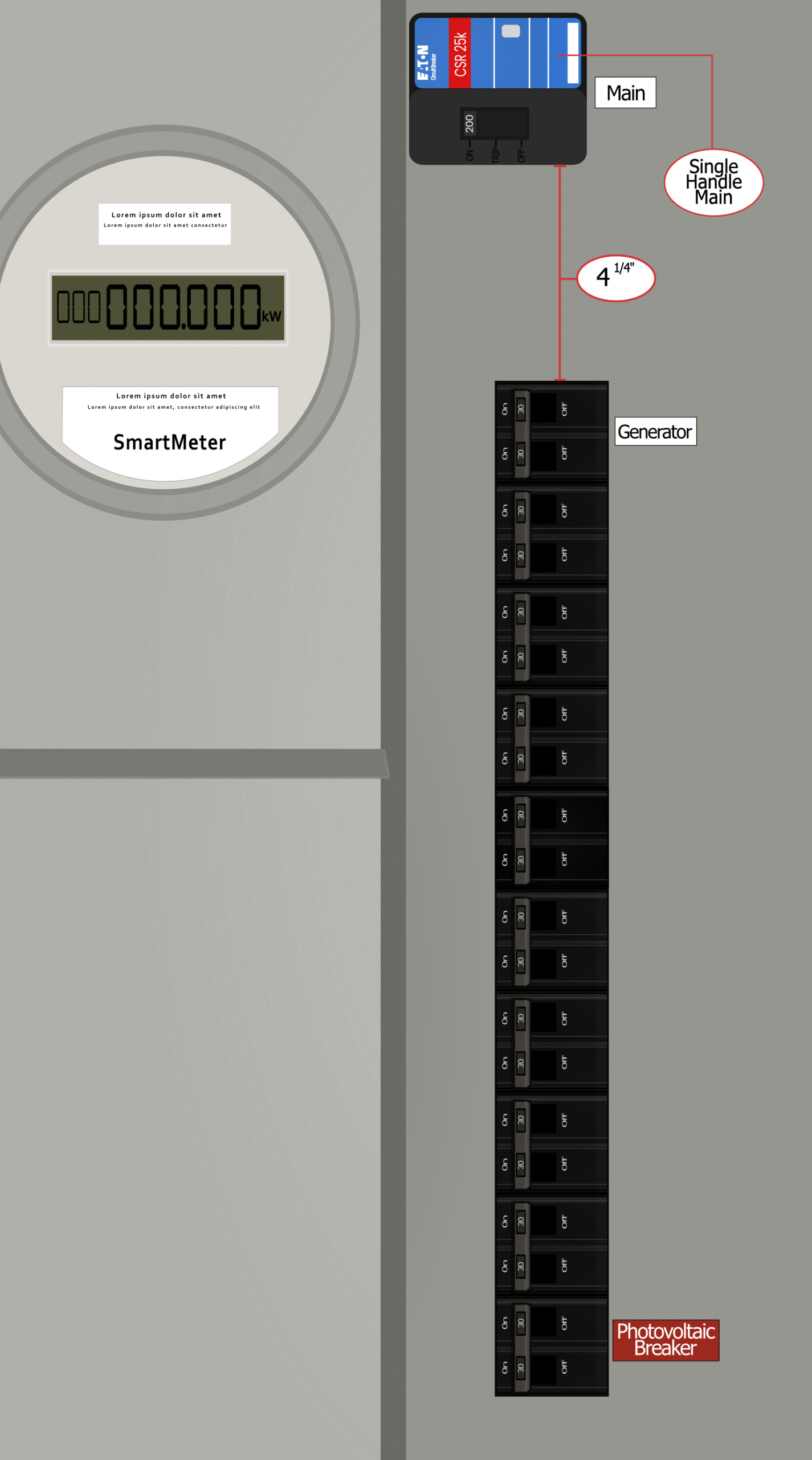 - Main breaker is offset left of the breaker column