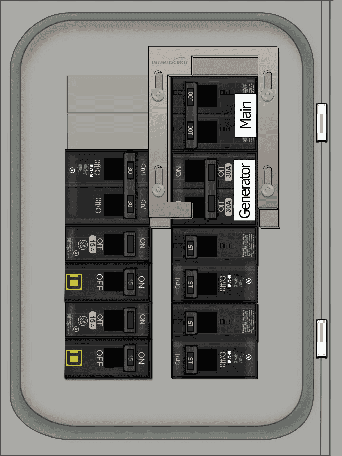 - Install a two pole generator directly below the main breaker in spaces: 6 & 8