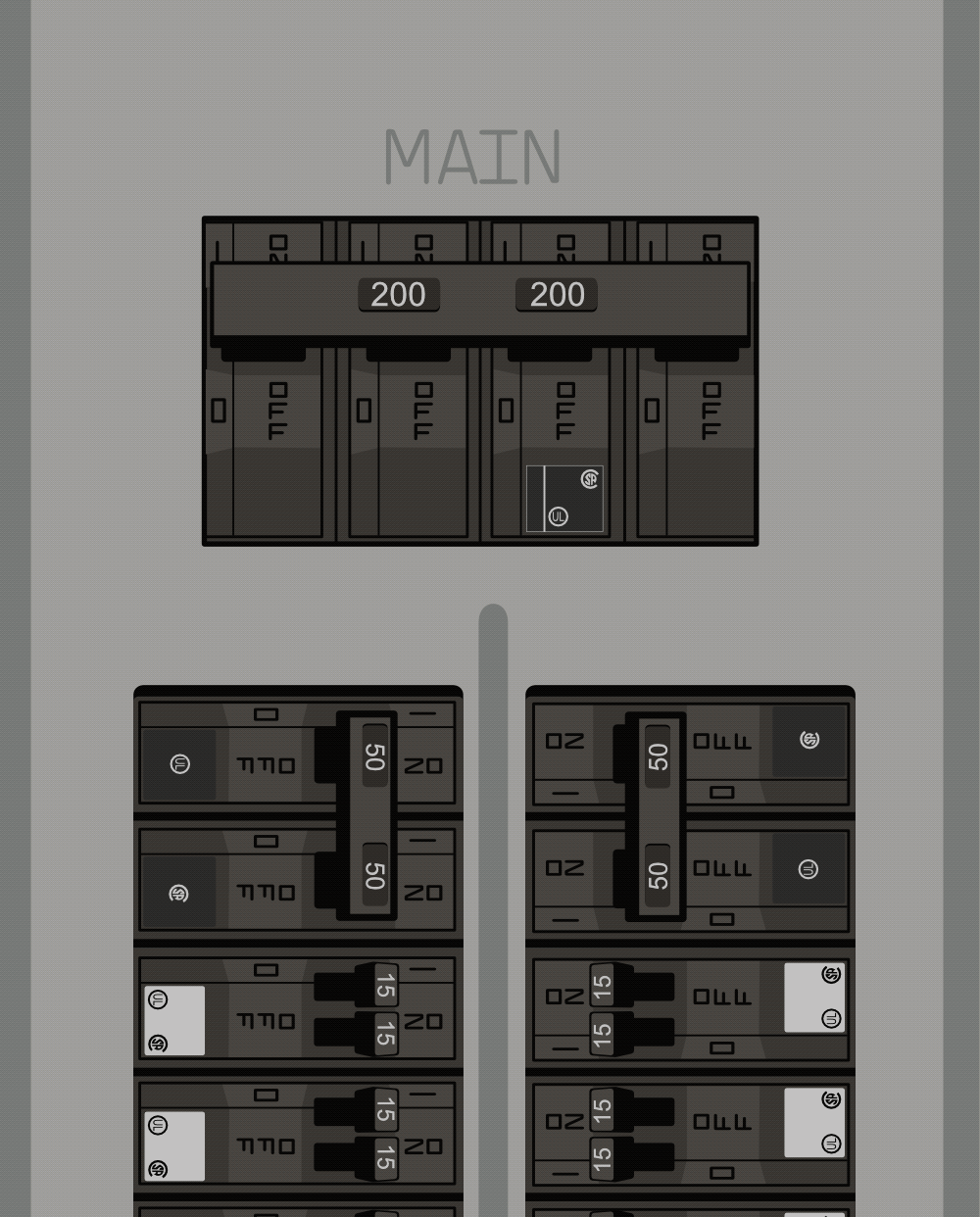 - Main breaker is centered over both breaker columns