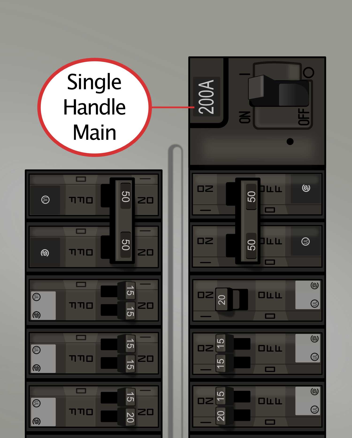 - The main breaker sits directly on top of breaker stack in the right breaker column